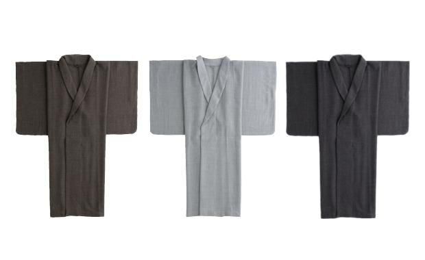 薄手のウールガーゼで仕立てた、ショール感覚の上着。羽織や和装コートとは異なる形で、何通りもの着方が楽しめる。前の打ち合わせを開けたままなら羽織風、閉じればコート風に。衿を寝かせても、立てても着られる。ヘリンボーン風の織り柄のある生地で、糸の染めに奥行きのある3色展開。